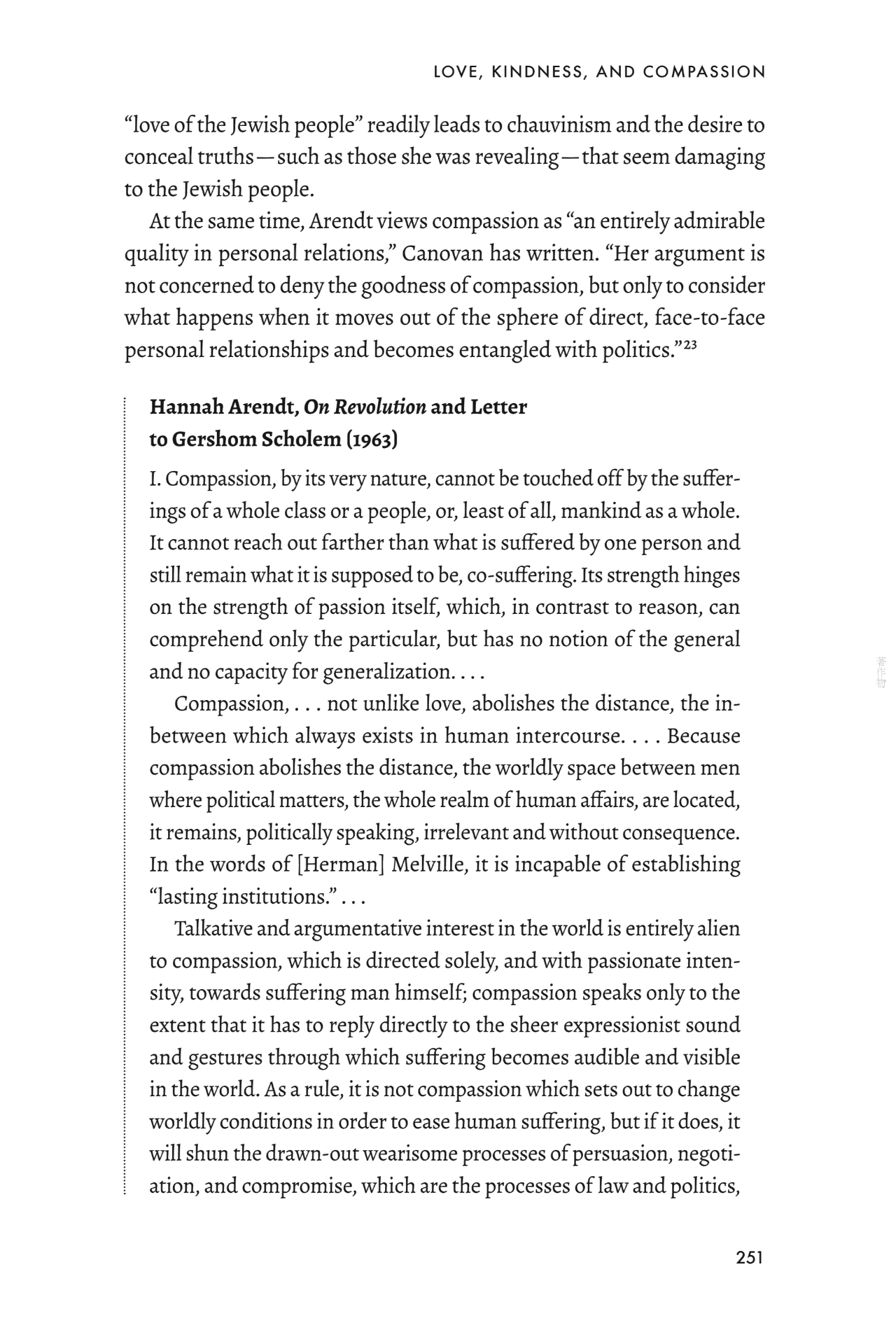 You are quite right – I am not moved by any ‘love’ of this sort, and for two reasons: I have never in my life ‘loved’ any people or collective – neither the German people, nor the French, nor the American, nor the working class or anything of that sort. I indeed love ‘only’ my friends and the only kind of love I know of and believe in is the love of persons. Secondly, this ‘love of the Jews’ would appear to me, since I am myself Jewish, as something rather suspect. I cannot love myself or anything which I know is part and parcel of my own person. To clarify this, let me tell you of a conversation I had in Israel with a prominent political personality who was defending the – in my opinion disastrous – non-separation of religion and state in Israel. What [she] said – I am not sure of the exact words any more – ran something like this: ‘You will understand that, as a socialist, I, of course, do not believe in God; I believe in the Jewish people.’ I found this a shocking statement and, being too shocked, I did not reply at the time. But I could have answered: the greatness of this people was once that it believed in God, and believed in Him in such a way that its trust and love towards Him was greater than its fear. And now this people believes only in itself? What good can come out of that? Well, in this sense I do not ‘love’ the Jews, nor do I ‘believe’ in them; I merely belong to them as a matter of course, beyond dispute or argument.
