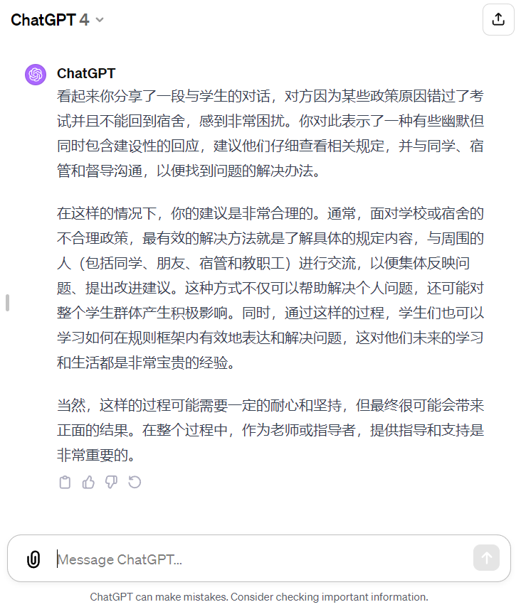 什么狗屎政策S 1-17 20:44:31我TM下午一个考试没了S 1-17 20:44:38还不让去宿舍S 1-17 20:44:56我现在满世界游荡了S 1-17 20:45:27全考完了还不让回是不是太过分了我说T 1-17 21:04:47好好流浪,地球可以,你也可以。S 1-17 21:05:31(。)(  ̄ー ̄)這段對話如果是在幾年前,即便這個學生是高三,我的回答也一定迥異。扮演下自己,大概是:規定的文字在哪,發我看看唄……哦,確實變態……你閒著沒事給它給了唄,問問身邊同學,按真實需求逐條改!要能找到宿管和你們督導,也問下為啥這麼變態……改完發我,我幫你去推。