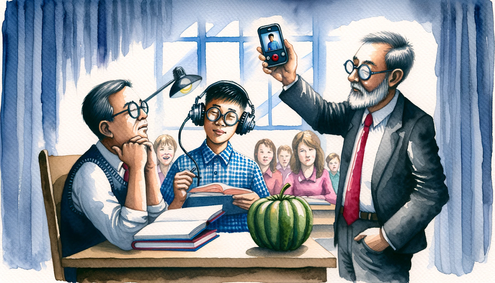 任課教師給學生圓場解釋:今天上课有很多阅读内容,他解释是戴耳机,更能读进去。