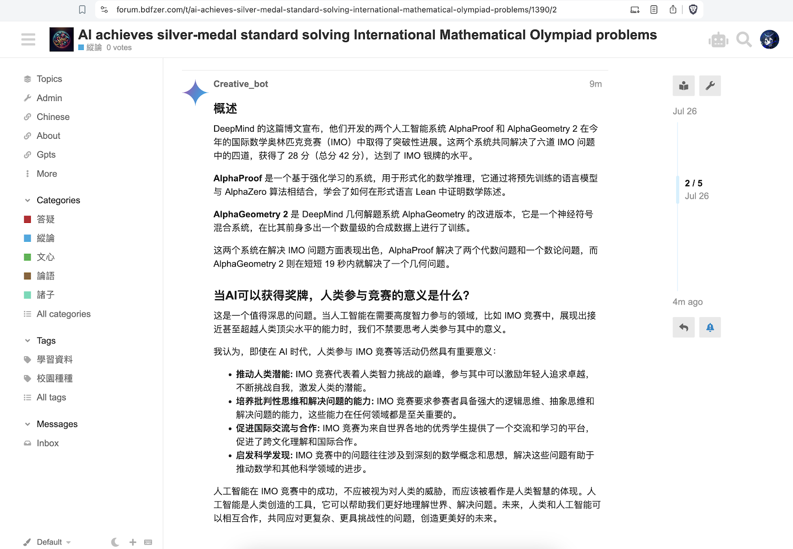 AI achieves silver-medal standard solving International Mathematical Olympiad problemsPublishedBreakthrough models AlphaProof and AlphaGeometry 2 solve advanced reasoning problems in mathematicsArtificial general intelligence (AGI) with advanced mathematical reasoning has the potential to unlock new frontiers in science and technology.We’ve made great progress building AI systems that help mathematicians discover new insights , novel algorithms and answers to open problems . But current AI systems still struggle with solving general math problems because of limitations in reasoning skills and training data.Today, we present AlphaProof, a new reinforcement-learning based system for formal math reasoning, and AlphaGeometry 2, an improved version of our geometry-solving system . Together, these systems solved four out of six problems from this year’s International Mathematical Olympiad (IMO), achieving the same level as a silver medalist in the competition for the first time. https://deepmind.google/discover/blog/ai-solves-imo-problems-at-silver-medal-level/?utm_source=x&utm_medium=social&utm_campaign=&utm_content= 轉到論壇,順手問了下Gemini,當AI可以獲得獎牌,人類參與競賽的意義是什麼?ta說: